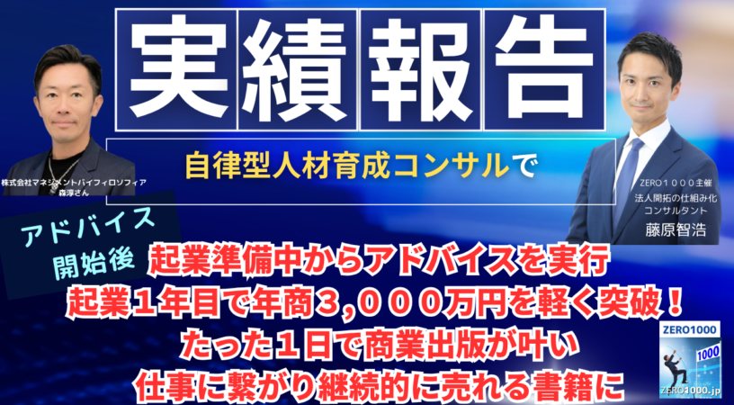 【実績報告】自律型人材育成コンサルタントが起業準備中からアドバイスを実行。起業1年目で年商3,000万円を軽く突破!たった1日で商業出版が叶い、仕事に繋がり継続的に売れる書籍に!