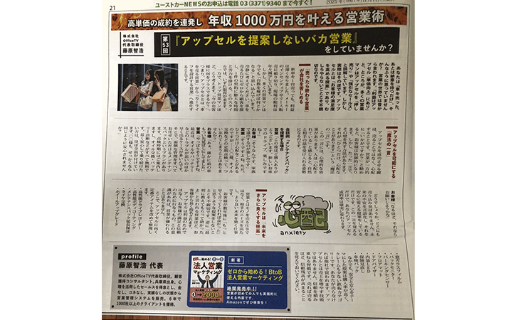 2025.11.1 ユーストカーNEWS11月号に掲載されました。 Tweet Share ユーストカーNEWS11月号に掲載されました。 第53回「アップセルを提案しないバカ営業」をしていませんか? ユーストカーNEWS10月号に掲載されました前の記事